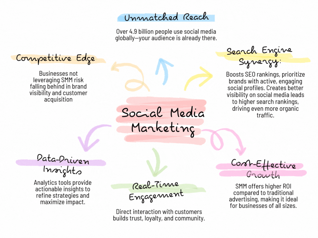 In today’s digital-first world, social media is more than just a platform for connection it’s a powerhouse for brand growth, customer engagement, and revenue generation. Social Media Marketing (SMM) leverages platforms like Facebook, Instagram, LinkedIn, Twitter, and TikTok to build brand awareness, drive traffic, and foster meaningful relationships with your audience.